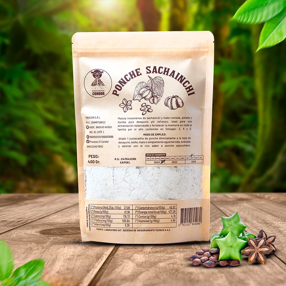 Ponche de Sachainchi-Haba es un alimento andino amazónico, mezcla nutraceutico en polvo de reconstitución instantánea, alimento de alto valor nutricional elaborado con Sachainchi y Haba previamente; seleccionado, extruido y pulverizado.