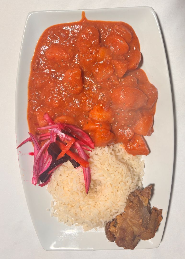 Nombre del Producto : PUCA PICANTE CON CHICHARRON Y/OCUY Descripción Breve del Producto: Plato de origen peruano – ayacuchano a base de papas, ají panca, maní, airampo con prese de chancho dorado o Cuy frito. Origen Cultural e Historia : Su origen es rural, campesino se consumía principalmente en los días de trabajo comunitario en el campo, luego del trabajo. Puca que significa rojo y Picante significa guiso. Ingredientes Principales : Papa, ají panca, airampo, maní. Preparación Básica (Resumen) : Doramos el aderezo a bace de ajo, cebolla, ají panca, airampo, seguidamente con un poco de agua se deja hervir, seguido a ello agregar la papa picada y dejar hervir hasta que agarre color y textura. Tamaño o Peso Aproximado de la Porción: dos cucharones Presentación del Producto : con arroz y presa de chancho o cuy.